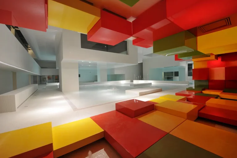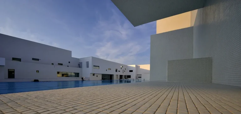 Le complexe dispose d’un vaste bassin principal entouré de jeux de lumière, créant une ambiance féérique et élégante.